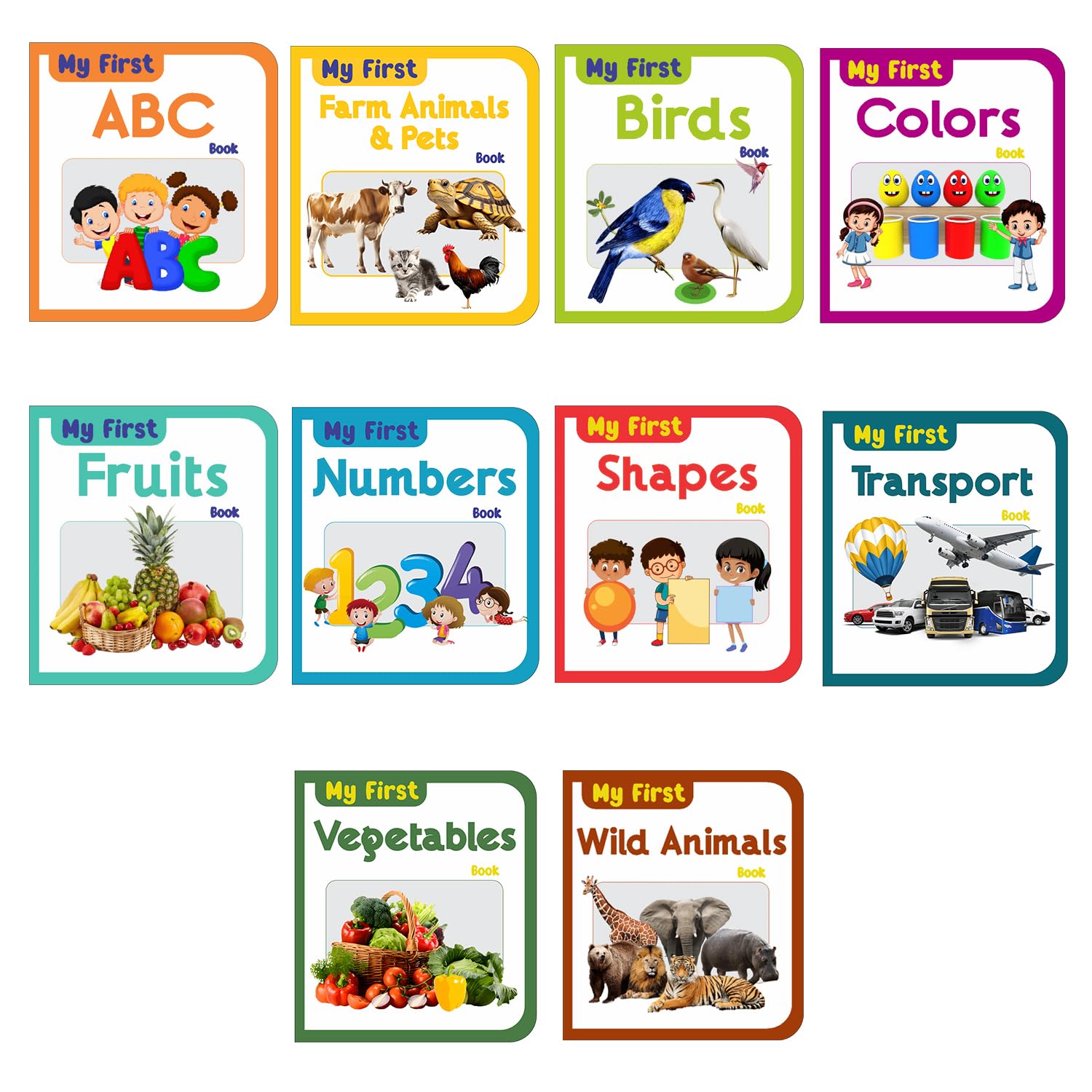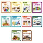 β 10 Engaging Board Books β Covering ABCs, Numbers, Colors, Shapes, Fruits, Vegetables, Animals, Birds, Opposites, and Vehicles.